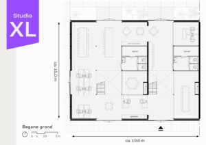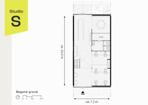 De studio’s zijn op de begane grond allemaal afgewerkt met een stoere gevlinderde betonvloer. De 1e verdiepingsvloer wordt gemaakt van stalen balken en kolommen ingevuld met een houten balklaag. Deze basis inrichting versterkt het industriële karakter van de loods en vormt tegelijkertijd een solide vetrekpunt voor verdere inrichting van de betreffende huurder. Tevens is er vloerverwarming & koeling in de basis aanwezig gecombineerd met een warmtepomp en PV-panelen.